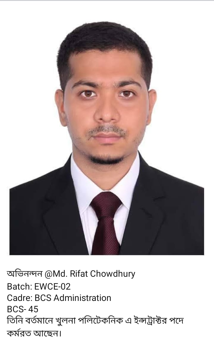 Nishat Islam from Batch EWCE-04 has been selected for the BCS Technical Education (Civil) cadre and is currently serving as a Lecturer in the EWCE Department at MIST. Md. Rifat Chowdhury from Batch EWCE-02 has qualified in the BCS Administration cadre and is currently serving as an Instructor at Khulna Polytechnic Institute. Additionally, Abu Saleh Muhammad Musa from Batch ME-15 has qualified in the BCS Technical Education cadre.