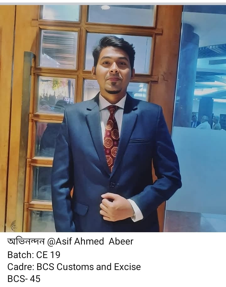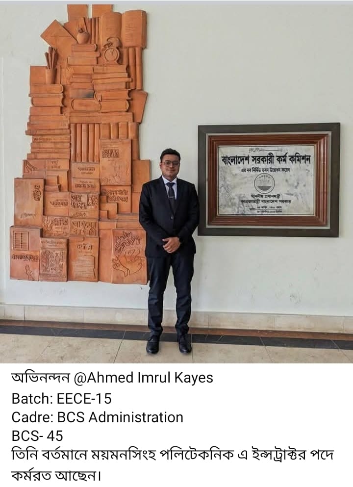 Ahmed Imrul Kayes from Batch EECE-15 has qualified in the BCS Administration cadre and is currently serving as an Instructor at Mymensingh Polytechnic Institute. Asaduzzaman Nur from Batch EWCE-03 has been selected for the BCS Ansar cadre. Abir Mahbub Titom from Batch IPE-02 and Asif Ahmed Abeer from Batch CE-19 have both qualified for the BCS Customs and Excise cadre.